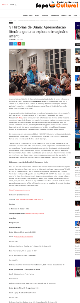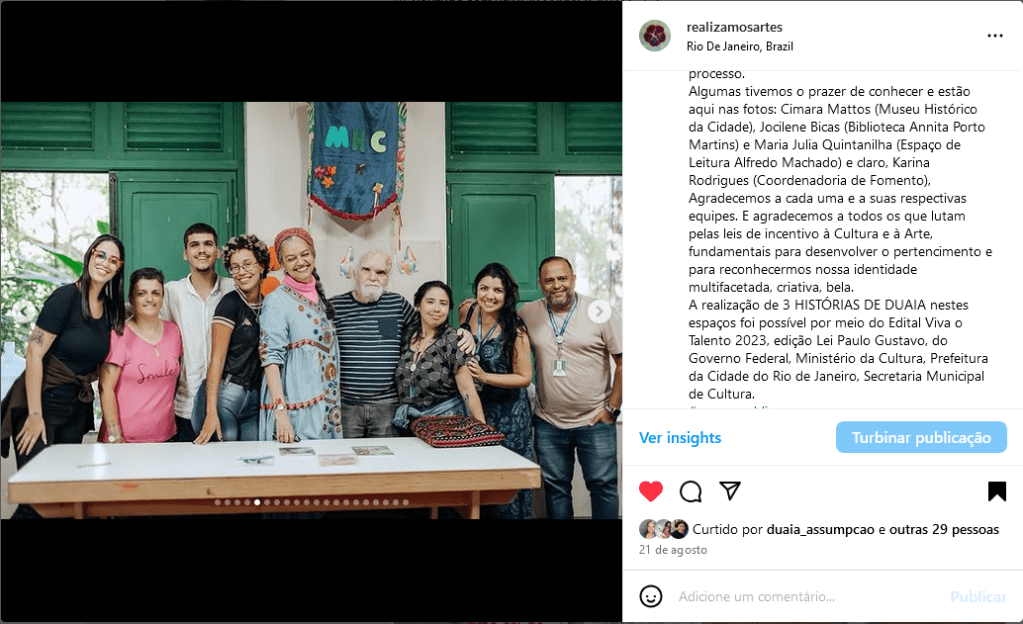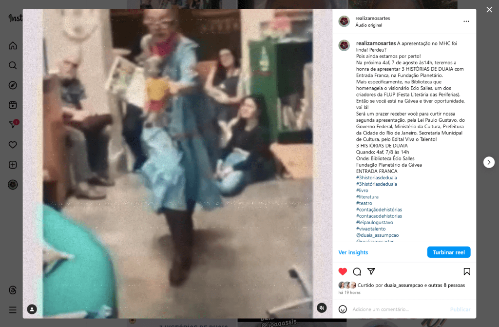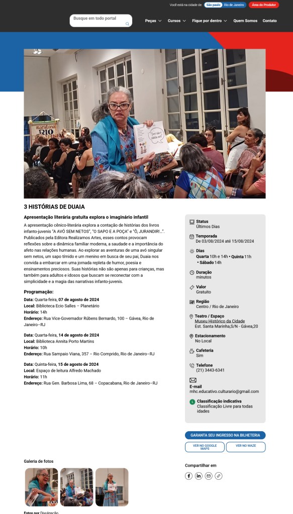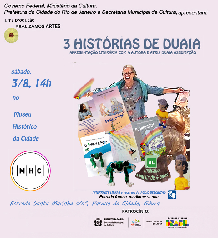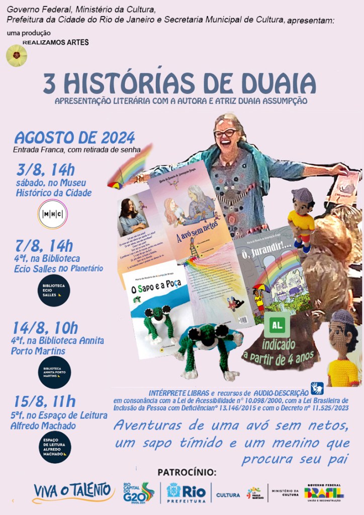 Em agosto de 2024, realizamos 3 HISTÓRIAS DE DUAIA pelo Edital Viva o Talento 2023 – Edição Lei Paulo Gustavo do Governo Federal, Ministério da Cultura, Prefeitura da Cidade do Rio de Janeiro e Secretaria Municipal de cultura. Nas imagens, um pouco dos encontros, vivências, descobertas que surgiram a cada apresentação. Literatura em cena, contação de histórias, teatro solo, técnicas mistas e interativas que encontraram ressonância no público infantil e no adulto também. E deixam gostinho de quero mais!