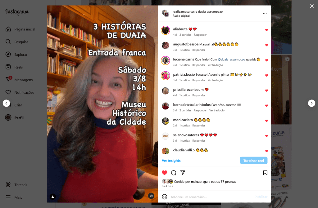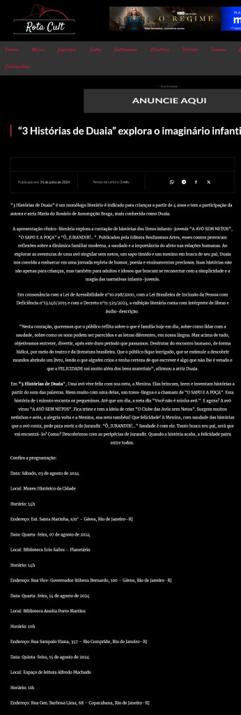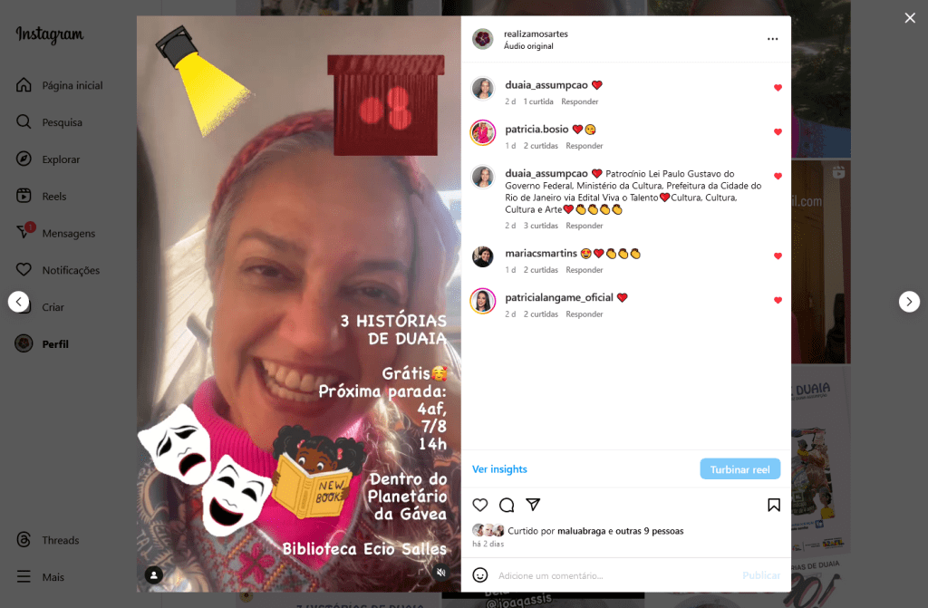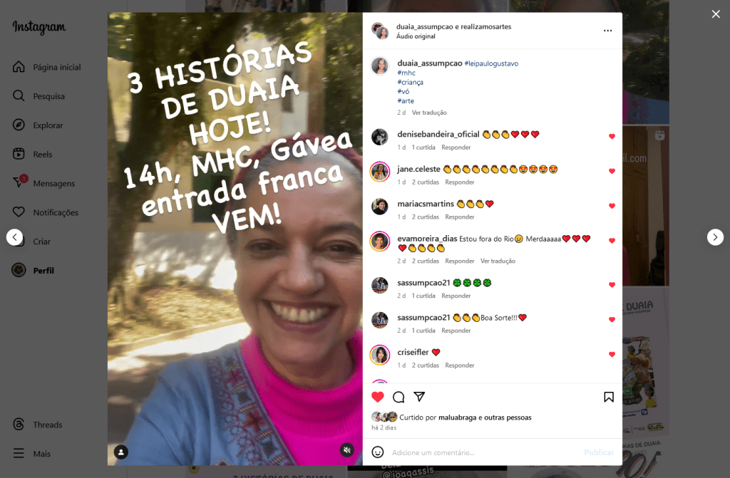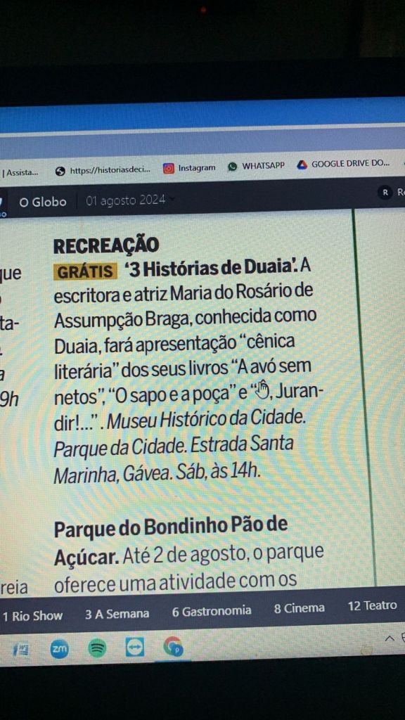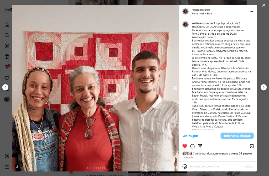 Em agosto de 2024, realizamos 3 HISTÓRIAS DE DUAIA pelo Edital Viva o Talento 2023 – Edição Lei Paulo Gustavo do Governo Federal, Ministério da Cultura, Prefeitura da Cidade do Rio de Janeiro e Secretaria Municipal de cultura. Nas imagens, um pouco dos encontros, vivências, descobertas que surgiram a cada apresentação. Literatura em cena, contação de histórias, teatro solo, técnicas mistas e interativas que encontraram ressonância no público infantil e no adulto também. E deixam gostinho de quero mais!