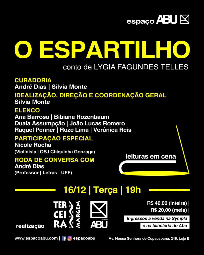 Duaia Assumpção participa da leitura de “O ESPARTILHO”, belo texto de Lygia Fagundes Telles, com direção de Sílvia Monte no projeto Leituras em Cena, no Espaço ABU, na Av. N Sra Copacabana, 249.