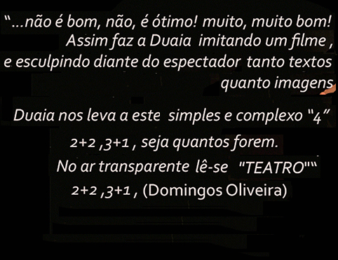 No espetáculo, Duaia conta com supervisões dos premiados (na ordem das fotos) Ronald Teixeira (Arte), Domingos Oliveira RIP (Direção), Joaquim Assis (Dramaturgia e inserts sonoros) e Jacyan Castilho (movimento).