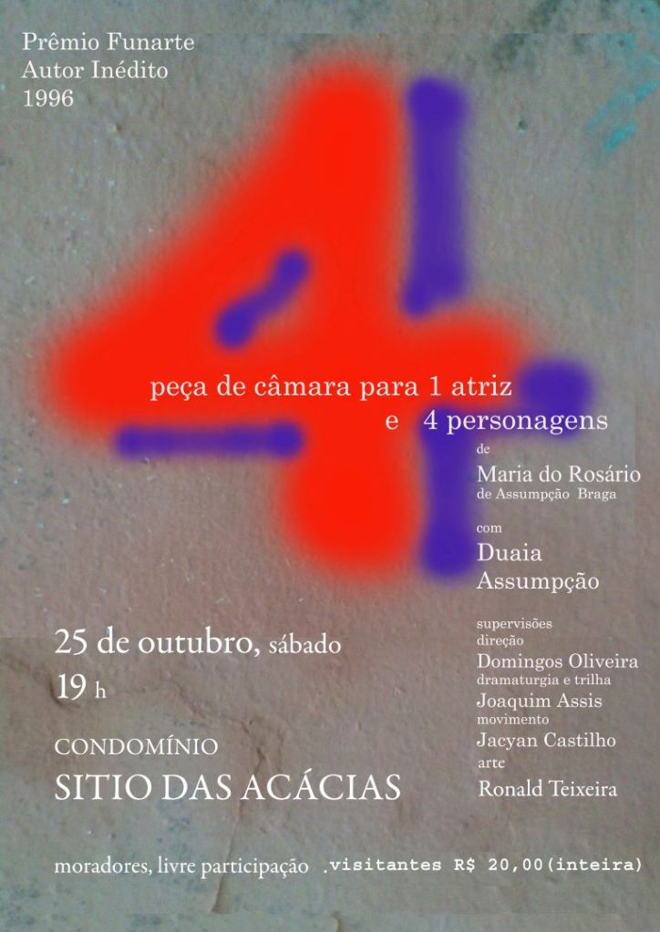 Em 2020, seguindo a percepção de que 4 é na verdade uma tetralogia, desenvolvemos a pesquisa 4 – Peça de Câmara e Libras , que foi contemplada pelo Edital Cultura nas Redes da SECEC RJ, de forma online, respeitando o isolamento social causado pela pandemia.