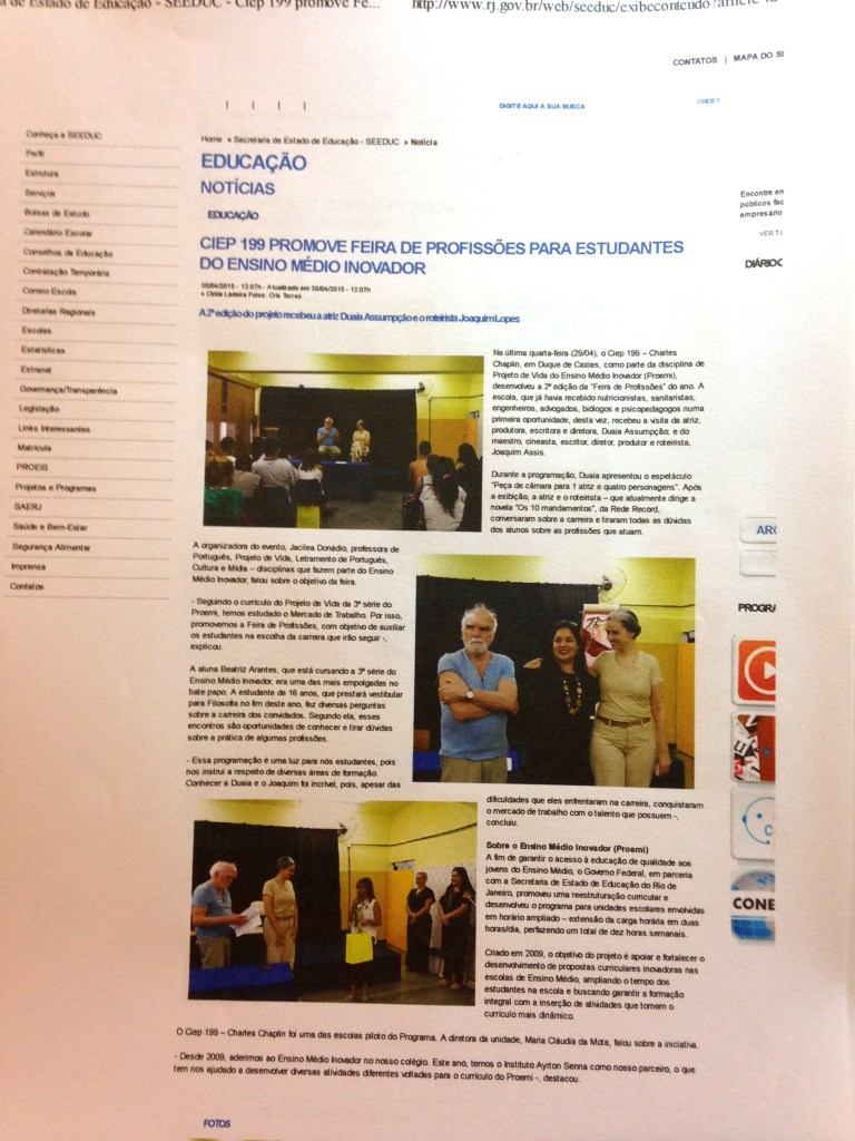 Abril, 2015. 4 convidado a participar da Feira de Profissões do CIEP 199 – Charles Chaplin, Jardim Gramacho, RJ.
