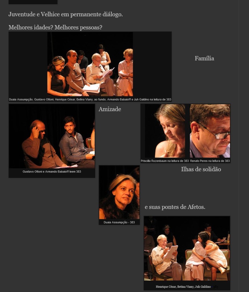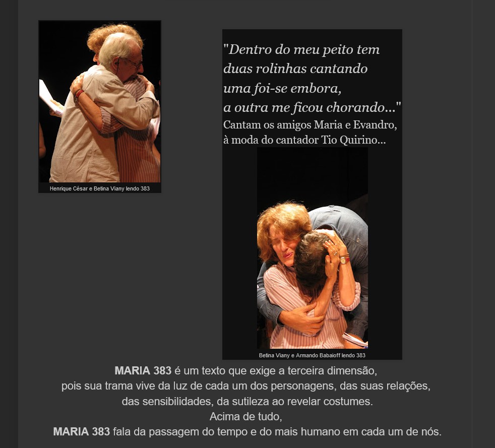 Em 2015, foi realizada a LEITURA DRAMÁTICA DO TEXTO de Joaquim Assis, com direção de Domingos Oliveira (RIP) e um elenco de peso. Cristina Bethencourt e Betina Viany compartilharam o papel de Maria.