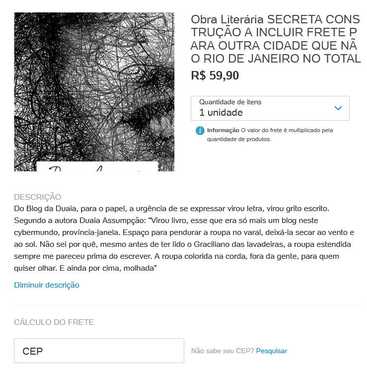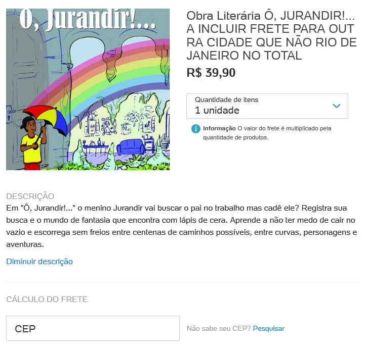 ATENÇÃO AO ESCOLHER A ENTREGA: HÁ DIFERENÇA SENDO NA CIDADE DO RIO DE JANEIRO OU EM OUTRA CIDADE, POR CAUSA DO CUSTO DE ENVIO.